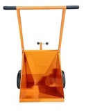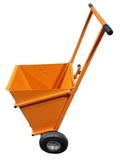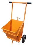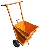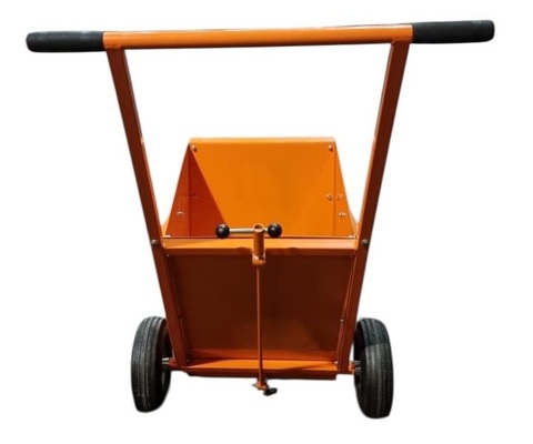 Форма и угол наклона контейнера обеспечивают плавную и безостаточную подачу песка на дозатор. Механизм дозирования выполнен из металлической шпильки со скрытой резьбой М10, что предотвращает ее загрязнение и обеспечивает длительную эксплуатацию в различных погодных условиях. Весь корпус тележки покрыт антикоррозийным средством и покрашен в яркий оранжевый цвет.